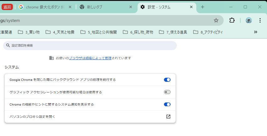 この症状が起きるときは以下のように、Chromeのシステム設定(設定 → システム)の”グラフィック アクセラレーションが使用可能な場合は使用する”がONになっており、PCによってはこれが起因して症状が出る。